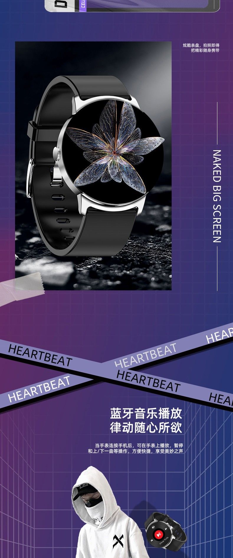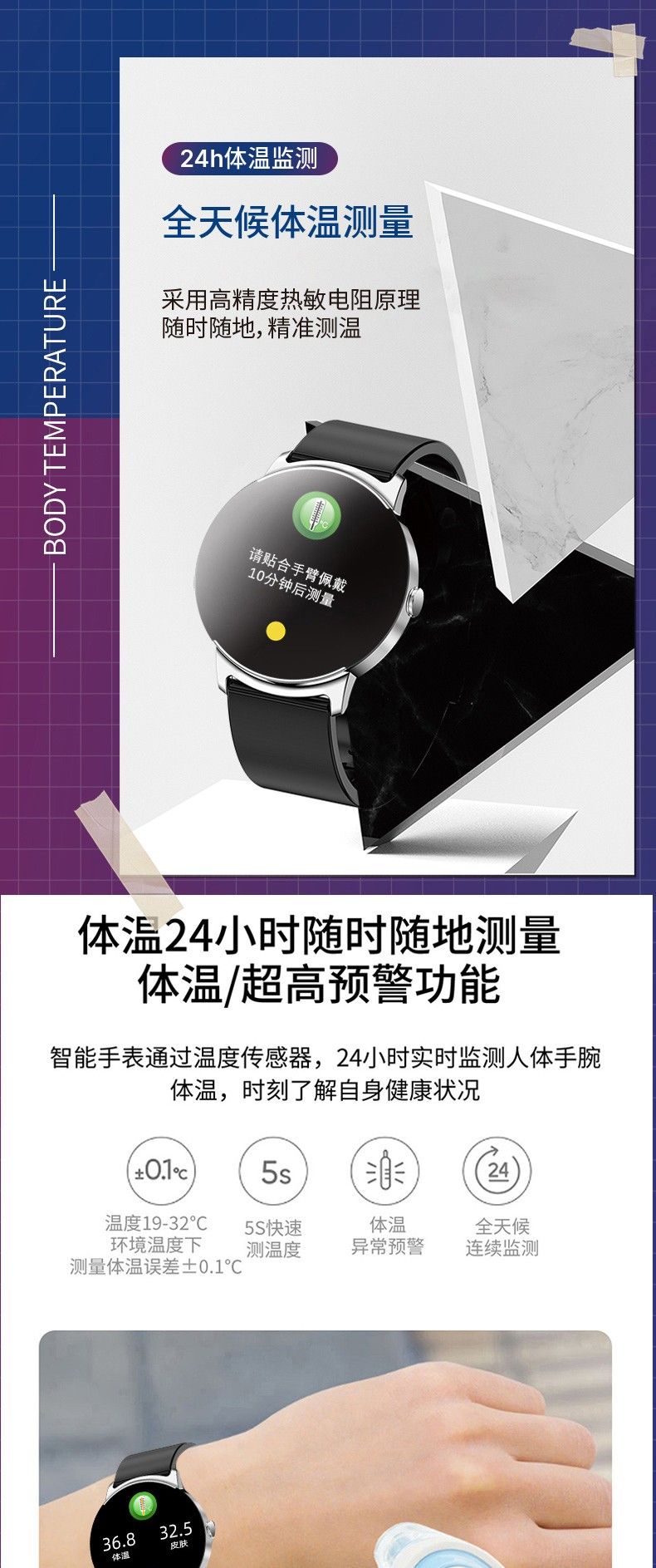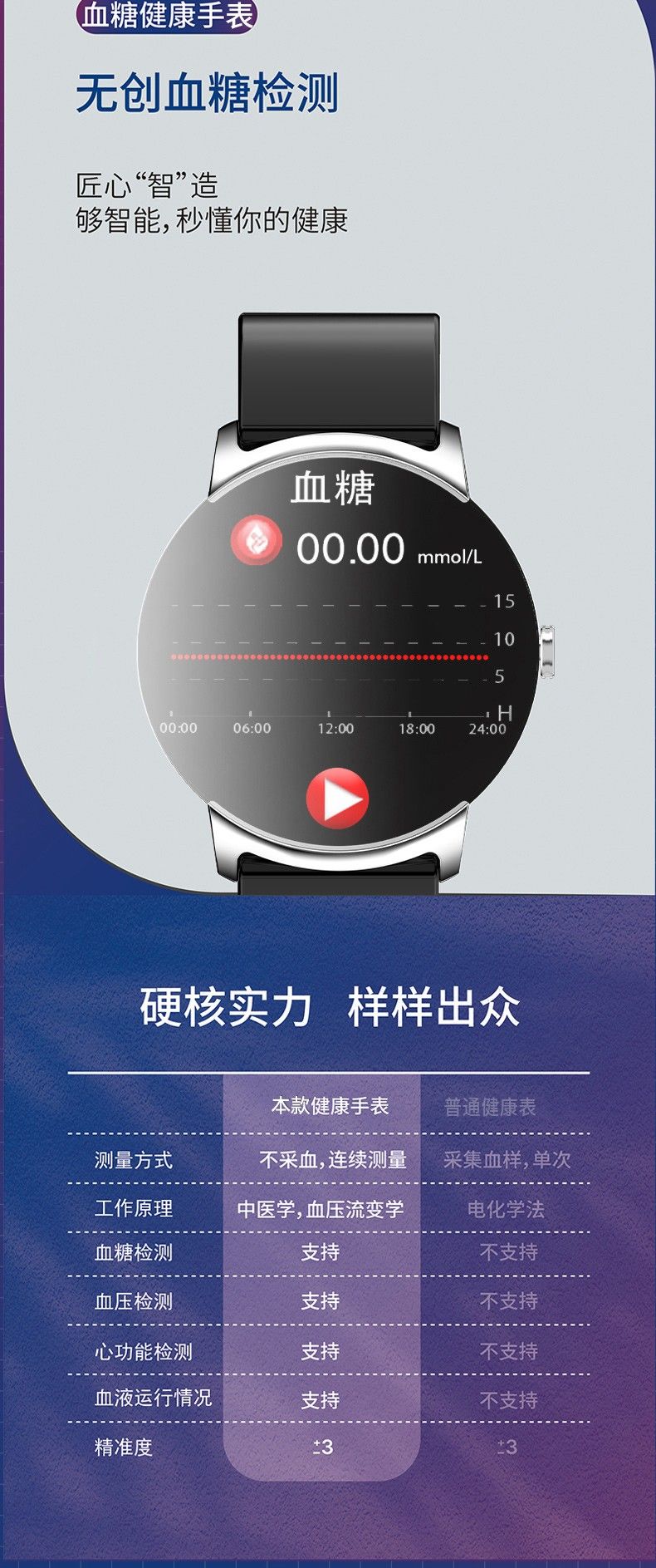 血氧,体温,血糖,血压监测,心率监测,睡眠监测,自定义表盘 ,女性生理周期,计步,短信提醒,电话提醒,距离,卡路里监测,闹钟提醒,触摸按钮,倒计时,摇摇拍照,久坐提醒,秒表