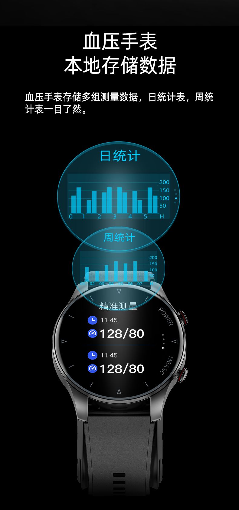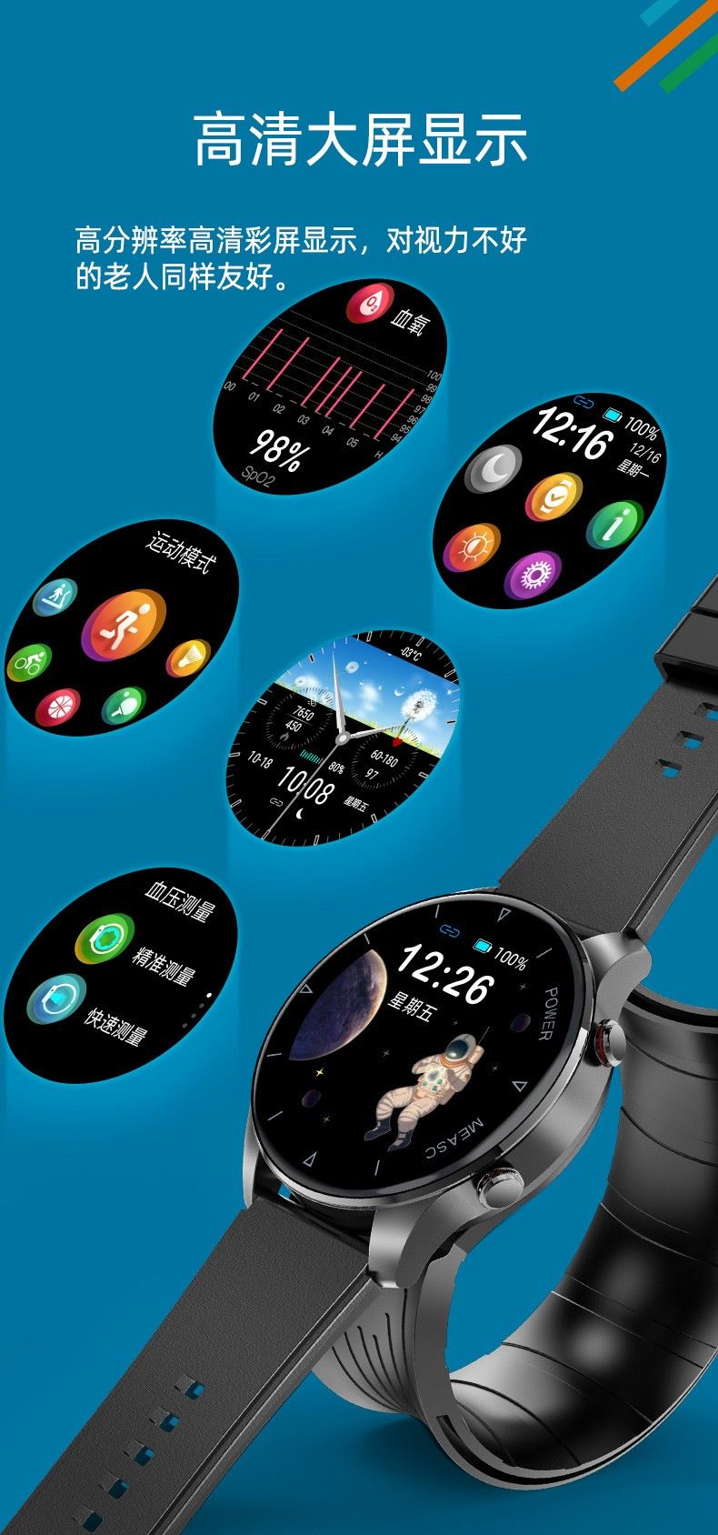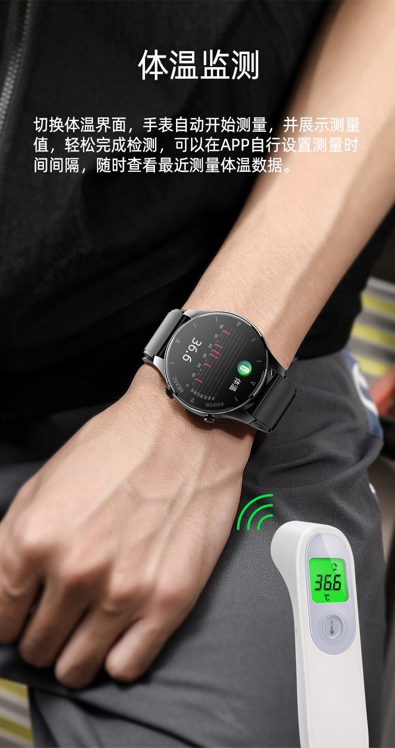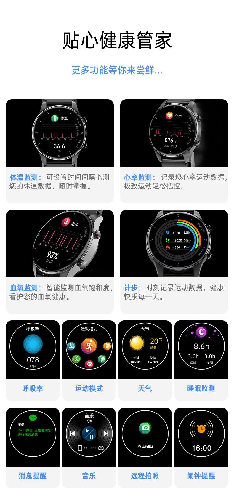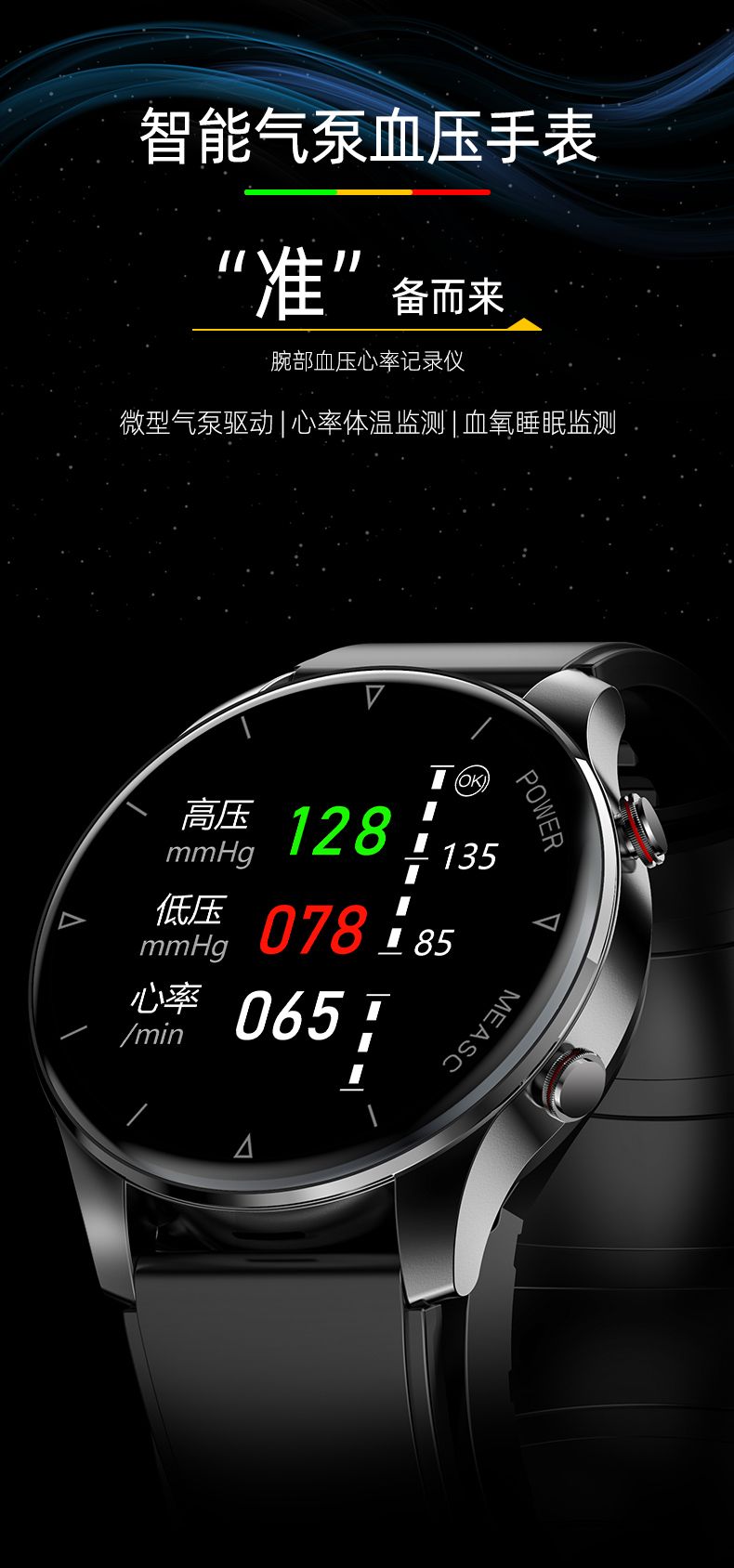 气泵+气囊式真血压测试,独立精准血氧,体温,呼吸率,血压、心率、睡眠监测,远程亲友关爱,闹钟提醒、久坐提醒、短信提醒、微信提醒、QQ提醒、来电提醒、翻腕亮屏、拒接电话、多运动模式、寻找手环、运动计步、运动轨迹、卡路里、天气预报、微信运动、信息存储、IP67防水
