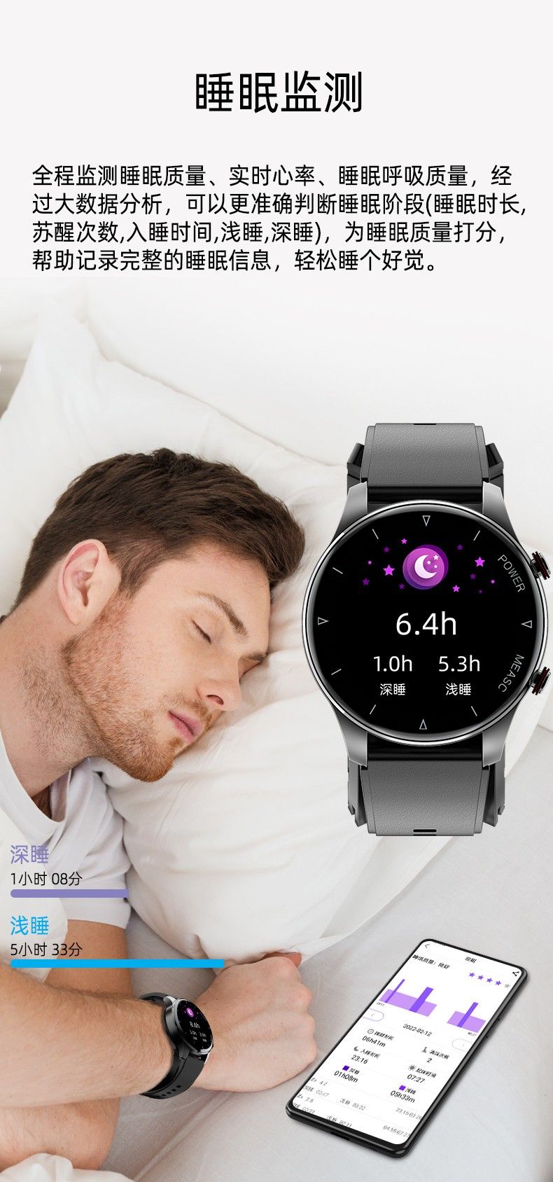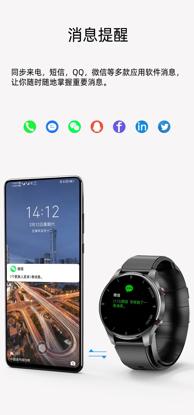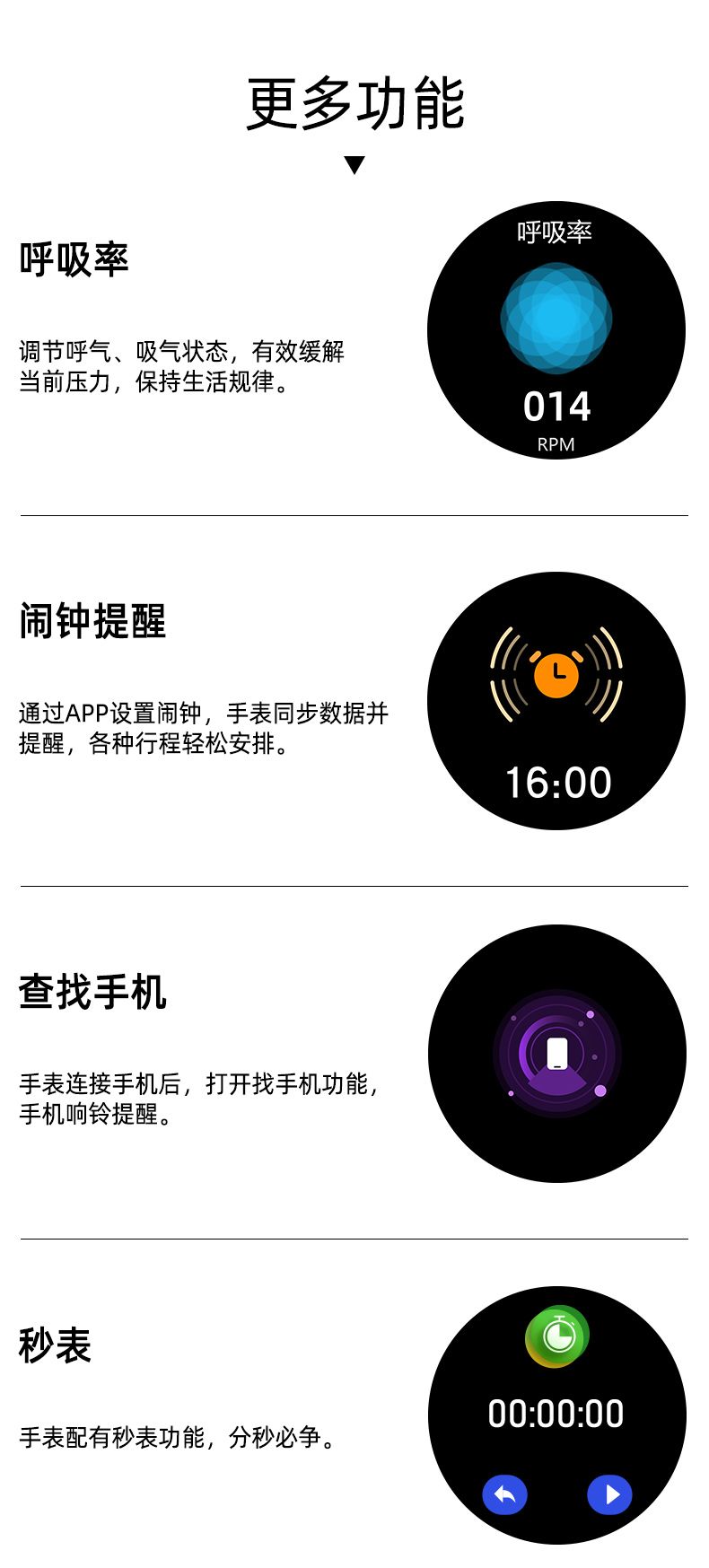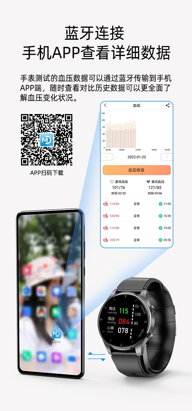 气泵+气囊式真血压测试,独立精准血氧,体温,呼吸率,血压、心率、睡眠监测,远程亲友关爱,闹钟提醒、久坐提醒、短信提醒、微信提醒、QQ提醒、来电提醒、翻腕亮屏、拒接电话、多运动模式、寻找手环、运动计步、运动轨迹、卡路里、天气预报、微信运动、信息存储、IP67防水