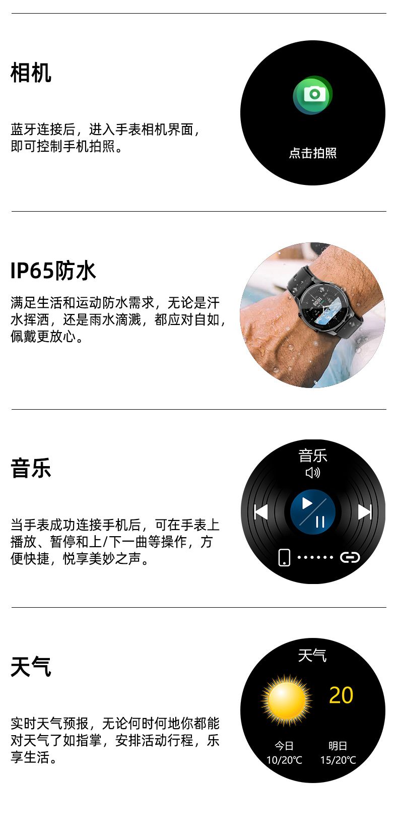 外观时尚,高清800万摄像头(插值像素3200万),Ai语音唤醒,AI拍照识物,AI智能问答交互 、AI智能翻译,高清拍照和摄像录像(带防抖功能),录音,WIFI传图到手机(照片视频录音),滑动调节音量 ,佩戴检测,双麦克风降噪,通话降噪,智能语音助手、蓝牙通话、音乐播放(切换、暂停音乐欣赏、音量加减)、低功耗杰里+全志主控芯片,续航持久、双物理按键+滑动触摸便捷操作、39g轻质整机重量佩戴舒适、可配置墨镜、蓝光、变色、近视等多种镜片,280MA大电池.IP65防尘防水(点胶防水工艺),优化发热散热架构。