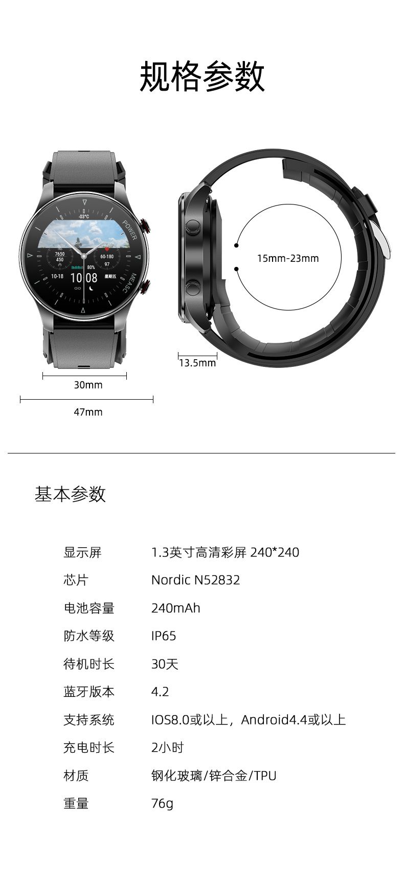 双频定位北斗+GPS 随时随地查看当前位置,采用双频定位北斗+GPS定位模式 多种运动模式 蓝牙高清通话 健康监测评估 科学睡眠监测 轻薄机身设计 AMOLED触摸屏